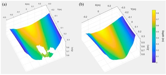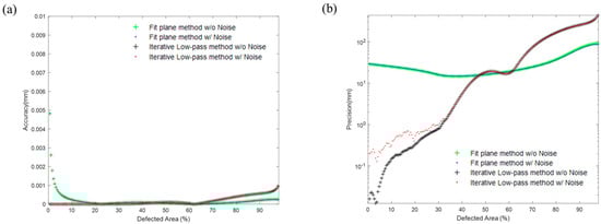 We also conducted a comparative analysis between the Depth Image Completion Process (DICP) and polynomial surface fitting methods [41,42]. The polynomial surface fitting method considers available inlier data, iteratively seeking the best-fitting surface to fill the defected area. Figure 5a,b presents the accuracy error and precision error of the DICP in the presence of added high-interruption noise.