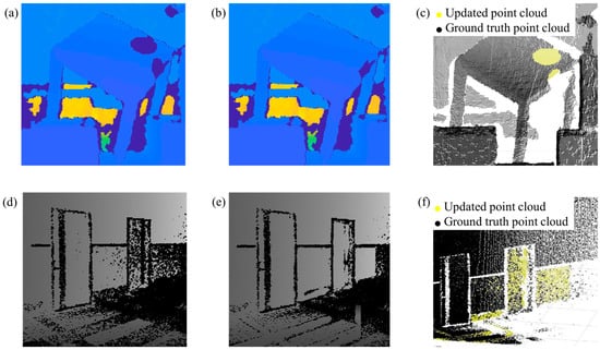 Moving on to Figure 7d–f, we present the completion results from the Kinect 2.0, which utilizes the Infrared Time-of-Flight (IR ToF) technique for depth image acquisition. Capturing both RGB and depth images under sunlight illumination and on a glossy granite floor tile, which disrupts the Kinect 2.0 IR signal, presents challenges. However, with proper segmentation of the operation blocks, our method proved effective in recovering highly sparse data. It is important to note that the experiments considered a defect rate below 42.77%. The point cloud results affirm the correct positioning of the recovered point cloud, demonstrating our method’s capability to recover depth information accurately from both shiny surfaces and non-reflective materials in Figure 7d.