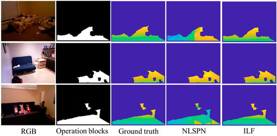 The depth-image completion results of the 9409 raw depth matrices were evaluated using the Root Mean Square Error (RMSE), Mean Absolute Error (MAE), and Absolute Relative Error (Rel), presented in Table 1. In direct comparisons, ILF consistently achieved smaller values in RMSE, MAE, and Rel, underscoring its superior performance.