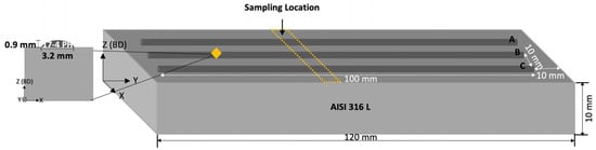 The optimal process parameters were chosen according to a preliminary investigation by the same authors [8]. Figure 1 depicts a scheme of the fabricated depositions, which consists of three 100 mm long single-track replicas (denoted as A, B, and C in Figure 1) being deposited with the selected process parameters on the AISI 316L substrate [8].