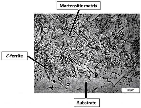 - In the as-built condition, the single tracks exhibited a microstructure composed of a lathy martensitic matrix with a high amount of lathy δ-ferrite, mainly located at the interface between the substrate and the depositions, with an average microhardness value of 392 ± 17 HV0.05.