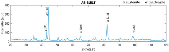 The X-ray diffraction pattern recorded on the single tracks in the as-built condition is shown in Figure 3. Considering the identified peaks, the presence of martensite () and austenite () was confirmed; however, it should be noted that the austenite peaks can be attributed to the austenitic microstructure of the substrate due to the limited area of the deposited tracks. The δ-ferrite peaks were not identified because of the overlap with the crystallographic features of the -martensite, as already observed by other authors [43,44,45]. No other peaks related to the presence of strengthening precipitates were detected.