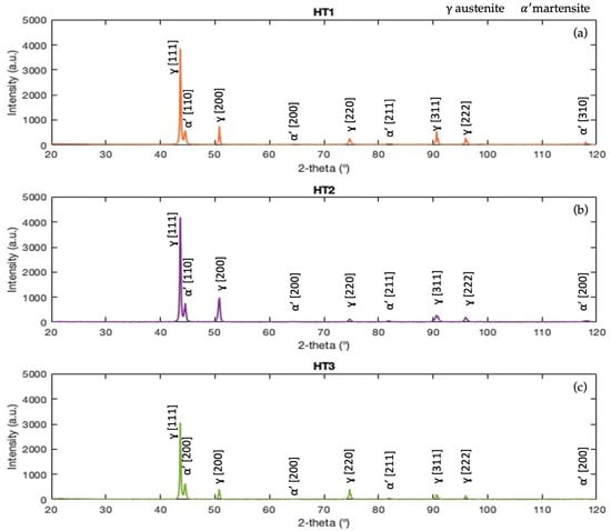 X-ray diffraction spectra of the single tracks heat-treated according to the (a) HT1, (b) HT2, and (c) HT3 routes.