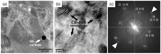 (a) STEM-HAADF images of HT4-treated specimen with a dark particle identified as Nb carbide (white arrow), (b) HRTEM view of the martensitic crystal domain with Cu-rich nanometric precipitates (black arrows), and (c) FFT of the image (b) with white triangles (c) pointing to extra spatial frequencies ascribed to Cu-rich precipitates.