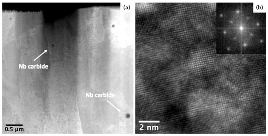 (a) STEM-HAADF images of HT5-treated specimen with the dark Nb carbides and (b) HRTEM view of the crystal domain (in the inset, the FFT of the TEM image with the spatial frequencies of the Fe lattice).