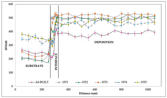 MeanVickers microhardness profiles (HV0.05) measured from the substrate up to the tip of all the heat-treated depositions. In the graph, the mean microhardness profile of specimens in the as-built condition is also shown and assumed as a reference.