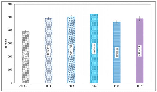 Vickers microhardness measurements were conducted on specimens in the as-built and PFHT conditions, following the UNI EN ISO 6507-1:2018 standard [40]. At first, three linear microhardness profiles for each deposition were acquired by a Future-Tech FM1e Vickers microindenter (Future-Tech Corp., Kawasaki, Japan) under a 50 gf load (HV0.05) with 15 s of loading time. In particular, the profiles were registered starting from the substrate up to the tip of the depositions. The mean Vickers microhardness was then assessed at the center of each single track in the same conditions, as an average of ten random indentations.