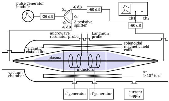 The line was filled with plasma by means of pulsed rf inductive discharge in argon under the pressure p = 4 × 10−4 Torr. Argon is used as an accessible and relatively inexpensive noble gas, which makes it possible to obtain slowly decaying plasma with well-reproducible parameters. Four induction coils (or inductors) 90 cm in diameter were installed inside the working segment of the line at a distance about 75 cm from each other, which ensured sufficiently uniform filling of the line with the plasma. The inductors were excited in pairs in parallel by two rf generators. The rf power applied to each couple of inductors was about 100 kW, the frequency was 5 MHz, the duration of the ionizing pulse was 1 ms, and the repetition rate of the ionizing pulses was one every 20 s.