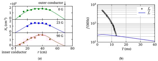Figure 2a). The dynamics of the decaying plasma density or electron plasma frequency measured at the maximum of the radial distribution and the magnetic field or cyclotron frequency, which was realized in the experiment, are presented in