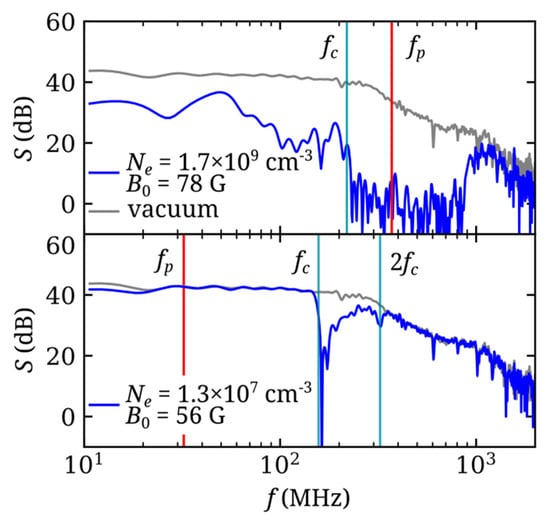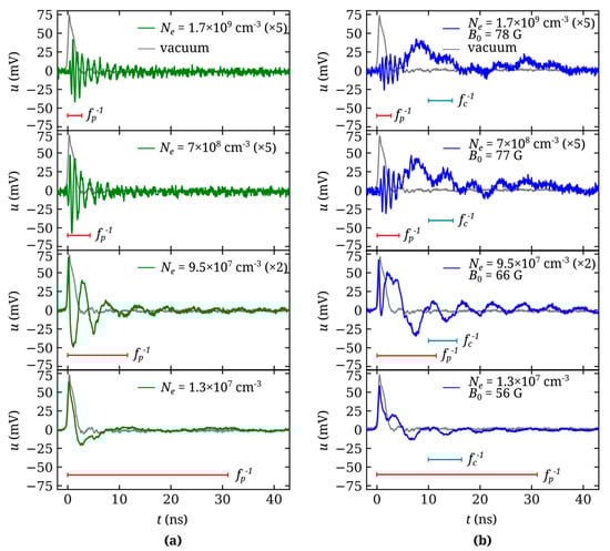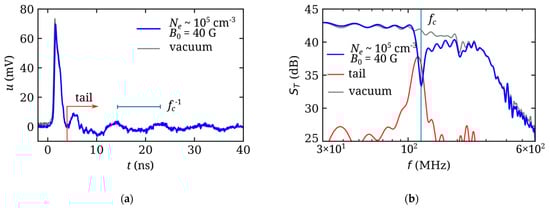 Figure 7 shows fragments of the waveforms obtained in the experiment in vacuum (without plasma) and with rare magnetized plasma, as well as the spectra of fragments of the waveforms corresponding to the initial EMP and the narrowband train of the damped oscillations.