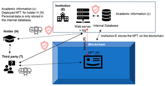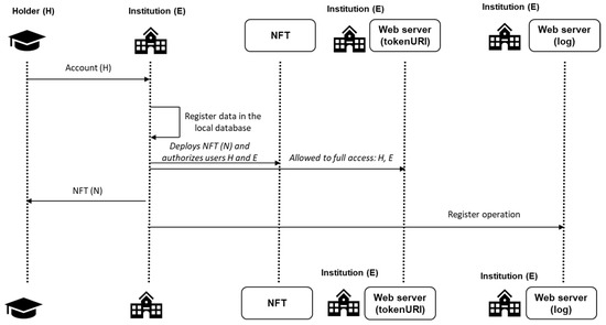 Figure 2 outlines the academic information’s issuance process. With this model, first, the user holding the academic information (H) informs the institution (E) of their account (H). Subsequently, the NFT with a tokenURI containing the (full) academic information is generated, as outlined in the model. The data (c) remains stored in the institution’s local database, and upon deploying the NFT, it adds the authorized accounts of H and E, as indicated. These operations are recorded in the web server’s log. As an optional element, to further enhance system reliability at regular intervals, for example, every 24 h, a hash summary of the log records can be registered on a blockchain. This way, any unauthorized alterations could potentially be detected.