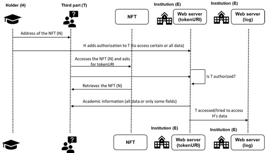 When a third party (with the address T) seeks access to specific academic details of the user, they request these details, through the platform, of the data holder (H). The data holder will grant authorization to T to access either all or certain parts of the data according to their wishes and interests. This permission information will be recorded at institution E associated with that specific NFT (N). H provides T with the address of N after granting permissions through the platform or other channels, and T requests access to N’s data. The data stored on the blockchain, such as the issuance date and time of the NFT, its creator, etc., pose no issue. However, the tokenURI queried will depend on T’s authorization. The system verifies T’s credentials and retrives the information of NFT N, providing either all the data or only specific parts as desired by the data holder H, generating a specific tokenURI that T can verify.