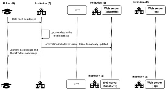 Of course, the deletion of information is also addressed, representing a specific case of data modification wherein the information is erased from the local database of the institution (cf. Figure 4). Consequently, no information will be generated in the tokenURI, and the NFT is invalidated (i.e., marked as invalid).