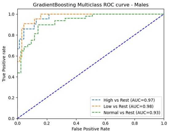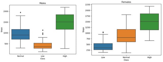 - Data cleaning: Data cleaning tasks allowed us to discover correct and sometimes eliminate erroneous data records or outliers and convert and standardize the data types necessary for processing in machine-learning algorithms. The Jupyter dashboard [23] was used with the Python 3 programming language, with its Pandas library; it is a rapid, robust, adaptable, and user-friendly open-source tool for data analysis and manipulation. The Seaborn library was used with its boxplot function to visualize the classes, as shown in Figure 1, where the high class has the highest proportion for both sexes. Points outside a boxplot are visual indicators of values that may be unusual or outliers compared to the rest of the data in the set.