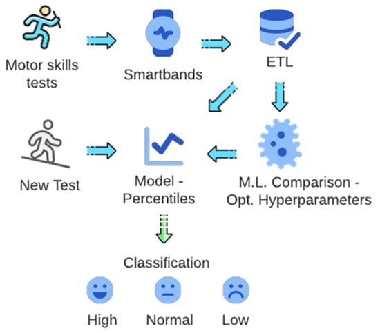 - Determination of objectives: The main goal focuses on exploring the use of smart bands and the application of machine learning optimized to promote physical activity and motor competence in schoolchildren and analyzing the potential benefits of this approach.