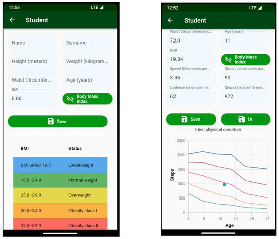 - Collection of initial data: Anthropometric measurements were conducted on-site at each school. The evaluation team comprised professional physical education teachers and research assistants. Weight and height were measured using Ross and Marfell Jones’s standardized method. To determine body weight (kg), a BC 730 (Tanita Corporation) electronic scale was used, with a scale from 0 to 150 kg. Standing height was measured using a portable stadiometer (Seca 216, Seca Gmbh and Co., Hamburg, Germany), accurate within 0.1 mm. Waist circumference (WC) was measured using a tape measure (Seca) to the nearest 1 mm. The body mass index (BMI) was calculated by dividing the kilograms of weight by the square of the height in meters: BMI = weight (kg)/height2 (m).According to the BMI Z-score, patients were classified as underweight/normal weight with Z-scores between −2 and +0.99, overweight from 1 to 1.99, obese from 2 to 2.99, and very obese ≥3 [20]. To categorize abdominal adiposity (WC) by age and sex, the suggestions described by Fernández et al. [21] were used. It was categorized into two groups (without risk < p75 and with risk > p75).The motor competence tests that were evaluated were the quantification of the number of steps during school recess, and the 6-minute walk test was performed using a smart band (Huawei band 7) with an AMOLED screen of 194 × 368 and with 1.47 inches. This smart band has been used in other similar research [22]. The smart band was placed on the wrist of each student’s hand, and its use was explained.