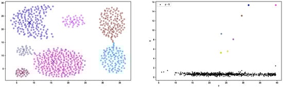 The data source for Figure 1 is referenced in [7]. The left image shows the shape distribution of the data, and the right image shows the decision graph of the data. The labels “1”, “2”, and “3” on the points in the right image indicate the data points with the top three scores according to Equation (4).