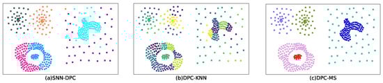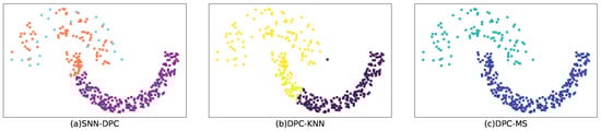 In Figure 4a, the points located on the right-hand side of the graph form a U-shaped cluster, often referred to as noise points. In such cases, neither the DPC-KNN method nor the SNN-DPC method can accurately classify these noise points. Furthermore, as observed in the results depicted in Figure 4, both the DPC-KNN and SNN-DPC methods struggle to classify circular clusters. In contrast, the DPC-MS method employs adaptive distance calculations during the classification process, leveraging local structures to preserve the primary cluster structure.