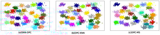 (a) The clustering results of SNN-DPC, (b) DPC-KNN, and (c) the proposed method (DPC-MS) on the D31 dataset.
