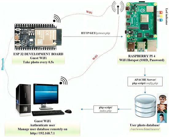 From a technical point of view, the present authentication mechanism used for experimentation comprises two main physical components: a Raspberry Pi 4 Model B system with an 8 GB LPDDR4 SDRAM and 1.5 GHz quad-core processor, interconnected with an Arduino ESP32 microcontroller, powerful tools of the last generation that integrate Wi-Fi and Bluetooth wireless capabilities for connections, as displayed in Figure 1. The Raspberry Pi microprocessor acts as an active hotspot that can be accessed by other devices and establishes a connection with the Arduino ESP 32 development board and the PC via Wi-Fi, which are considered to be Wi-Fi clients.