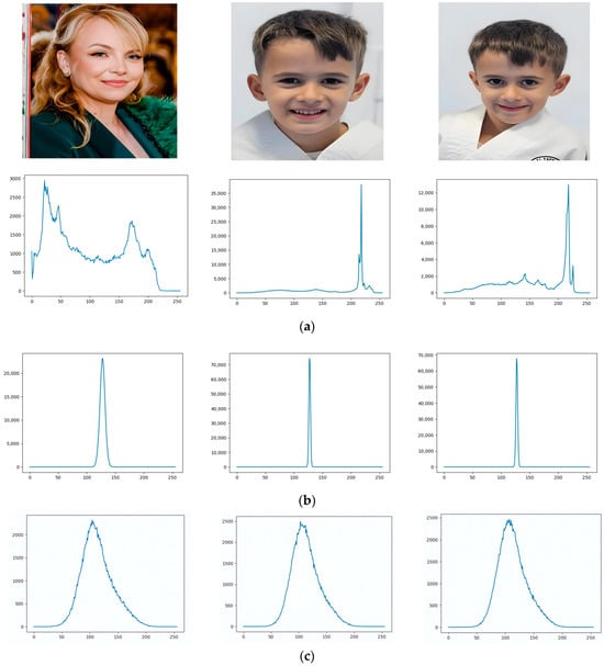 Histogram graphical representation of users 1, 2, and 3. (a) Original biometric image. (b) Encrypted image using the BFV algorithm. (c) Encrypted image using the BGV algorithm.