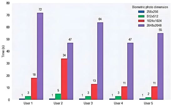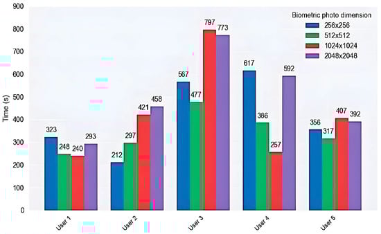 Finally, we focus our attention on the last parameter, probably one of the most relevant elements when we analyze the performance of cryptographic algorithms represented by the computational time that should be minimal for performing privacy-preserving face authentication and encryption in an attempt to achieve the best results and develop a robust and reliable mechanism of authentication. Time plays a crucial role in the entire encryption and decryption process, and a wide variety of external and internal factors related to computer performance such as hardware components, software applications, and cryptographic algorithm structure influence it.