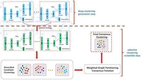 Generally, the clustering ensemble method refers to two steps: generation and consensus function. Generation is the first step in generating the set of base clusterings. In clustering ensemble, an appropriate generation process is very important because the final consensus result will be affected by the initial clusterings obtained in this step. The consensus function is the second step, and plays a major role in the clustering ensemble. It is a great challenge to define an appropriate consensus function to improve the results of single clustering algorithms. However, most of the existing base clustering algorithms used in the generation step of clustering ensemble methods are traditional shallow clustering algorithms. It is difficult for these traditional clustering algorithms to exploit deep features of the data and excavate the interdependence of complex data features in latent space [5]. Therefore, the performance of these shallow clusterings after aggregation will also be limited.