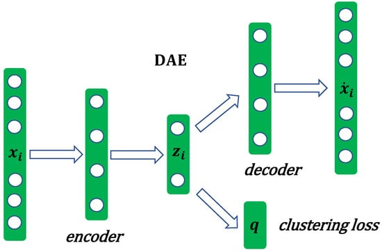 The framework of deep autoencoder clustering is shown in Figure 2. Deep autoencoder clustering consists of a fully connected autoencoder and a clustering layer, which is connected to the autoencoder embedding layer. In Figure 2, represents the i-th sample of the original input data and indicates the -th reconstructed sample. represents the deep low-dimensional embedding representation of the i-th sample. Given the original input data , deep autoencoder clustering firstly learns a mapping from the original data to a lower-dimensional embedding representation . Then, it maps each embedding point of the input sample to a soft cluster label q using a clustering layer. Therefore, the loss of deep autoencoder clustering contains two parts: non-clustering loss (or reconstruction loss) and clustering loss.