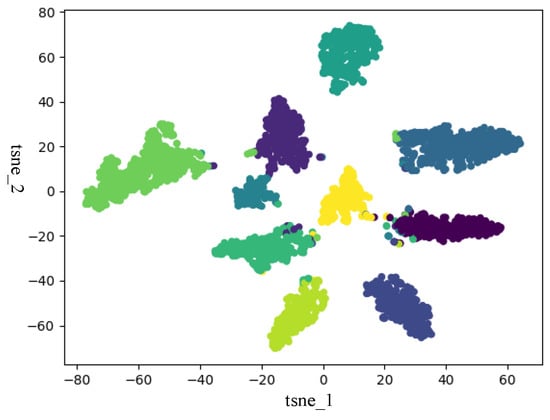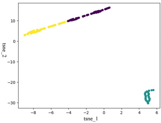In this section, to verify that ISDCE could achieve good clustering results, we adopted t-SNE to visualize the initial embedding and final embedding clustering results on Iris and Mnist5 datasets. The visualization results are shown in Figure 3, Figure 4, Figure 5 and Figure 6. The horizontal and vertical coordinates of tsne_1, tsne_2 in the figure are the scalar numerical coordinates of the initial embedding and the final embedding reduced to 2D features after t-SNE. The number of clusters visualized is the true number of categories on the dataset. Points of different colors represent samples in different clusters. It can be seen that the final embedding after joint optimization with clustering loss is more cluster-friendly and produces higher-quality clusters. We can easily observe that the final embedding trained by the joint clustering loss forms denser clusters with fewer mixed clusters. For the visualization results of the Iris data, the data are characterized in that only one class in the Iris data is linearly separable, and the other two classes are linearly indivisible. Therefore, visualizing the Iris results with t-SNE results in a situation where there are two clusters that are indistinguishable. But, in fact, from the two clustering evaluation measures, ISDCE indeed achieved good performance on these data.