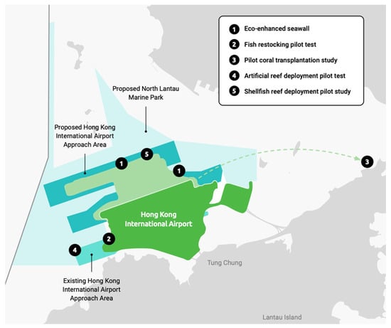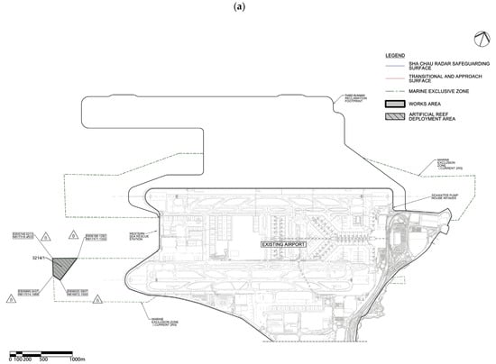 The Hong Kong International Airport (HKIA) Master Plan 2030 [2] revealed that the airport would reach a saturation point sometime between 2019 and 2022. A third runway was deemed essential, to be built on land reclaimed from the sea. The AA3214R project prompted calls from local green groups and residents to mitigate potential effects on marine wildlife—particularly the Chinese white dolphin—and noise impacts in the Pearl River Delta. The Airport Authority (AA) deployed 100 artificial reef (AR) units in the western waters of Hong Kong International Airport’s south runway (Figure 1) from mid-June to early July 2021. The ARs, placed near the future North Lantau Marine Park, serve as a pilot scheme to provide micro-marine habitats for enhancing the marine ecology and fishery resources [3]. In particular, the AR units were placed to develop a “fouling” community, including bivalves, sponges, tunicates, bryozoans, benthic algae and other associated organisms; to develop a complex habitat with numerous and varied refuges for predators, prey and/or foraging resources; and to promote the recruitment of adult and juvenile fish.