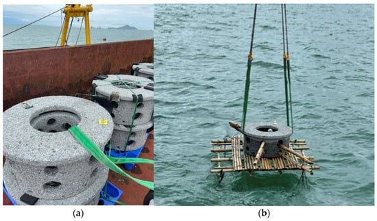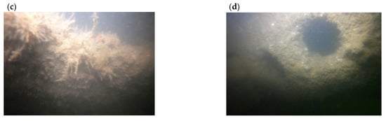 Photos of some AR units on the seabed (taken on 18 January 2022): (a) Large Unit No. 14 (side view); (b) Large Unit No. 41 (top view); (c) Large Unit No. 43 (side view); (d) Small Unit No. 68 (side view). See also Figure 4 for the location of the numbered units.