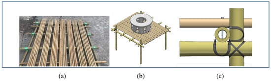 Components of the AR Unit Type 1: (a) bamboo mat; (b) axonometric view of the unit on the mat with legs; (c) detail of fixing the bamboo members of the mat with wood screws.