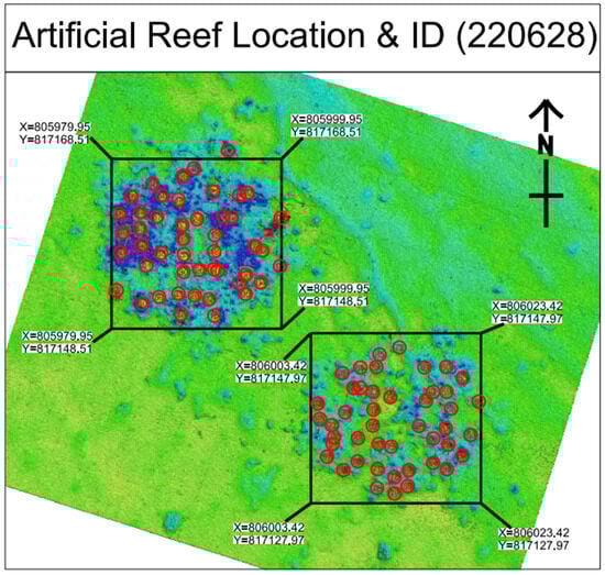 Multibeam survey showing AR units’ location (1 year after deployment) and identification numbers (in the red circles). (Coordinate reference: Latitude of Origin 22°18′43.68″ N; Longitude of Origin 114°10′42.80″ E; Northing Coordinate of Origin 819,069.80 mN; Easting Coordinate of Origin 836,694.05 mE).