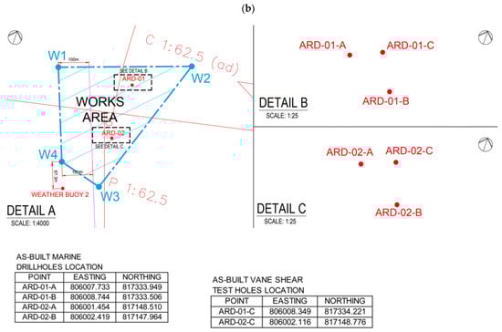 The stratigraphy information and undrained strength of the subsoil were obtained by making drillholes and vane shear test holes, whose location is reported in Figure 6a,b. Drillholes and vane tests pertain to two distinct subzones within the works area, indicated as ARD-01 (see detail B in Figure 6b) and ARD-02 (see detail C), respectively. The seabed in the works area is sub-horizontal, with some differences in level between ARD-01 and ARD-02, i.e., −4.90 ÷ −5.00 m and −4.75 ÷ −4.85 m, respectively, based on what was detected in correspondence of the holes.