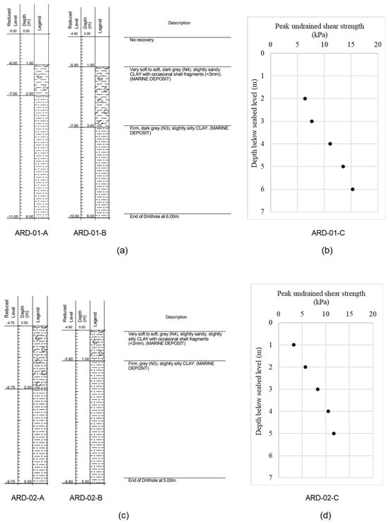 Stratigraphy of the subzones ARD-01 (a) and ARD-02 (c) and corresponding undrained shear strength profiles (b,d). Level of the seabed: −5.00 m for ARD-01-A, −4.90 m for ARD-01-B, −5.00 m for ARD-01-C, −4.75 m for ARD-02-A, −4.80 m for ARD-02-B and −4.85 m for ARD-02-C.