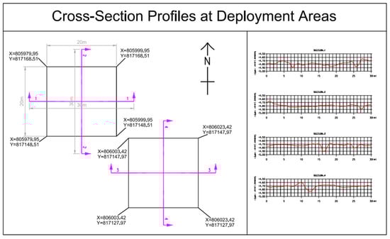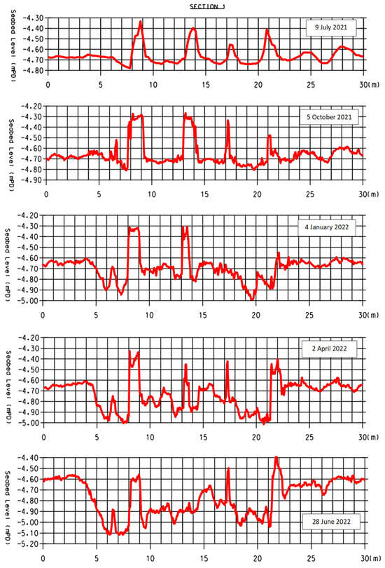 In Figure 9, where the variation of the bathymetric profile for Section 1 over the entire year of the survey is shown, the reef units are recognizable in terms of topographic heights. An initial depth reduction soon after the installation can be locally observed; this is probably due to the seabed humping just around the foundation, as an effect of undrained soil distortion.