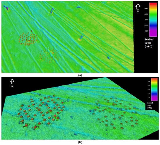 The data concerning the horizontal displacements of the units indicate that for most units both northward and eastward movement were zero, confirming the resistance to the submarine dynamic actions exerted by the small piles, i.e., the bamboo legs. In Table 2, the movement undergone by AR Large Units at the end of the monitoring period is shown (see their position in Figure 4). Due to marine activities, some AR units have their original location displaced with increasing amount of Seabed Scars (likely caused by Anchor drag). Thirteen Large Units exhibited, on average, displacements of more than 1 m (Table 2). However, as already mentioned, most units did not undergo significant horizontal drift, confirming the efficacy of the foundation legs.