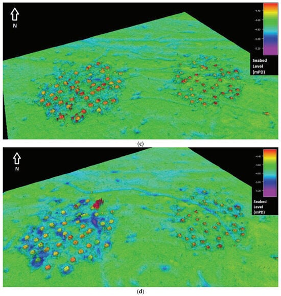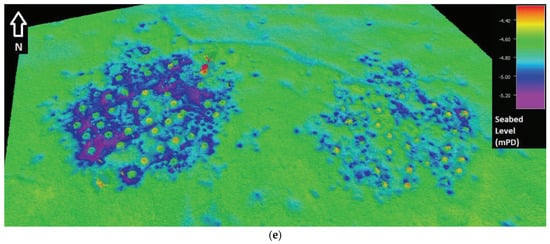 In Figure 10a–e, the 3D perspective view plots of the subsidence measured during the monitoring period are shown. The seabed hosting the reefs gradually and locally deepens.