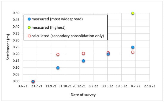 One year after reef deployment, settlements of about 25 cm were mostly widespread across the area, although some areal variability was observed. Locally, settlement peaks even higher than 50 cm could be seldom observed. In Figure 11, measured settlement values, representative of the most widespread subsidence detected across the area during each survey (based on visual inspection of the survey maps; see Figure 10), are plotted, together with the final highest value that can be identified among all AR units, as deduced from the final survey output (Figure 10e). The difference between the final highest value and the most widespread one could be indicative of the geotechnical heterogeneity of the area, as said before, and, as a contributing factor, of locally different submarine dynamic actions. In the same figure, the calculated evolution with time of the secondary settlement is also shown, under the hypotheses that viscous deformations took place soon after reef deployment (i.e., nominally since the 9 July 2021, to assign equal history to all units), the creep involved the upper layer only (using cα = 0.059, Table 1) and the deformation process was one-dimensional. The vertical displacements measured during the first year fit the values calculated for creep quite well. This observation seems to corroborate the interpretation that secondary consolidation is an important source of subsidence in this problem and that to depict a reliable subsidence scenario the soil viscous deformation must be assumed to start soon after reef deployment. The FEM calculation of the foundation primary consolidation settlement will confirm this hypothesis, as shown in the next section. Instead, no attempt was made to calculate the immediate settlement. Indeed, from the survey of July 2021, i.e., soon after the reef installation, it seems that the initial settlement of the reefs was negligible: the difference in depth between their tops and the surrounding seabed (Figure 10a) is practically equal to the height of the units. This is expected for the present case due to the small static loads and because the units have been deployed on the foundation without free-fall installation (Figure 2b), so that momentum effects on the initial settlement [14] may be neglected.