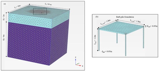 (a) Mesh of the 3D model employed in the FE simulation and (b) geometry and discretization of the raft-pile foundation model.