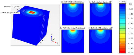 Results of the 3D numerical simulation at the end of the loading application in terms of contours of vertical displacement along two cross-sections: (a,b) raft with legs and (c,d) raft without legs.