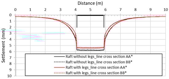 It can be observed that the raft-with-legs foundation uniformly settles under the applied load, exhibiting a rigid-body vertical movement due to the high stiffness of the bamboo material with respect to the surrounding soil (Figure 13a,b). The maximum primary settlement of the raft with legs is about 5.4 mm, without great differences between the two investigated cross-sections (Figure 14). As expected, the absence of the four legs causes a higher primary settlement of the bamboo raft, although the increase is marginal, as illustrated in Figure 14.
