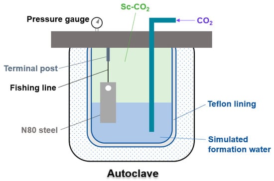 The presence of H can cause cracking in the metal matrix, and the formation of FeCO3 can result in scale formation on metal surfaces. This leads to a complex corrosion process when CO2 is present. Crucially, at the same temperatures, the rate of metal corrosion in the Sc-CO2 environment may be significantly greater than in a low-pressure gaseous environment. This can be attributed to two main factors. The first factor results in enhanced amounts of H2CO3, HCO3−, and CO32− in the aqueous solution due to the high solubility of CO2 in water at supercritical conditions. Consequently, the corresponding cathodic reaction rate increases, ultimately elevating the overall corrosion rate and substantially increasing the risk of damage to metal pipelines and casings [17,18,19]. The second factor stems from the ability of water to evaporate into Sc-CO2, leading the Sc-CO2 phase to contain trace amounts of water, making it highly corrosive to metals. Interestingly, metals in the low-water Sc-CO2 phase may experience more corrosion than in the water phase when CO2 has been dissolved. In recent times, there has been considerable attention in the literature on understanding the corrosion behavior of metals in Sc-CO2 environments [19,20,21,22,23,24]. Certain researchers have explicitly investigated the properties of metal corrosion in Sc-CO2 environments with low water percentages [25,26,27].