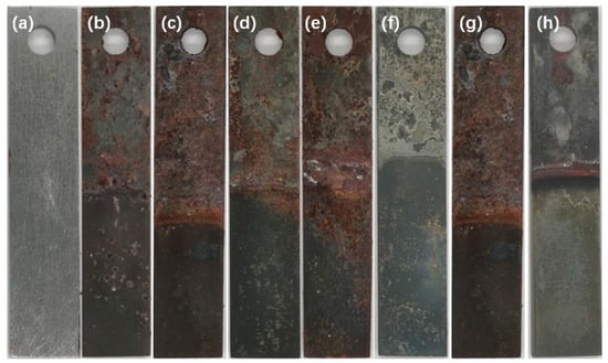 Pictures of the N80 steel surface after immersion experiments. (a) Before corrosion; (b–e) 3.5, 7, 14, and 28 d after corrosion, T = 80 °C; (f–h) 40 °C, 80 °C, and 120 °C, time = 7 d.