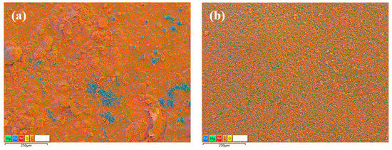 EDS images of the N80 steel samples after 7 days of corrosion, T = 80 °C. (a) Exposed to Sc-CO2; (b) exposed to the solution.