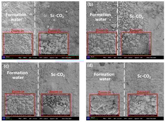 SEM images at the interface between the formation water and Sc-CO2 after 3.5 (a), 7 (b), 14 (c) and 28 (d) days of corrosion.