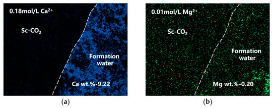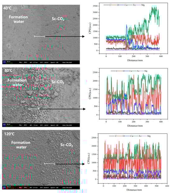 Figure 6 depicts the distribution of Ca and Mg at the interface of the solution and Sc-CO2 in samples immersed in solutions for 7 days, as determined by means of EDS surface scanning. Analysis of the graph indicated that in the constituents formed due to corrosion on the exterior of N80 steel, Ca was primarily located in the liquid phase, with only a small amount present in the Sc-CO2. On the other hand, Mg had a relatively uniform distribution in both the liquid phase and the Sc-CO2. The existence of Mg and Ca in the Sc-CO2 may be due to the splashing of some solution onto the upper portion of the steel sample during the CO2 gas-injection process, resulting in a residue of the solution on the specimen’s surface after exposure to the Sc-CO2 environment. This phenomenon indicated that in the Sc-CO2 environment, Mg from the solution was more prone to enter the corrosion products compared to Ca.