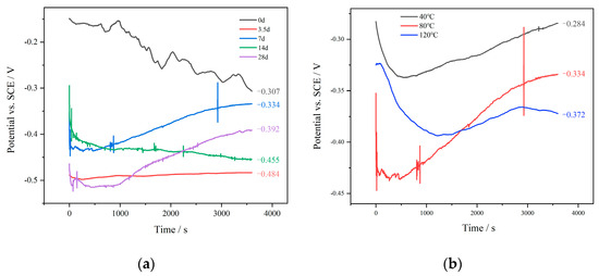 OCP variation for N80 steel in CO2-saturated formation water at various immersion times (a) and temperatures (b).