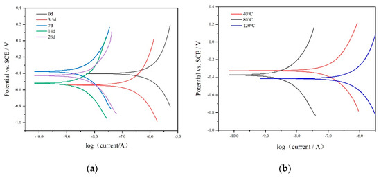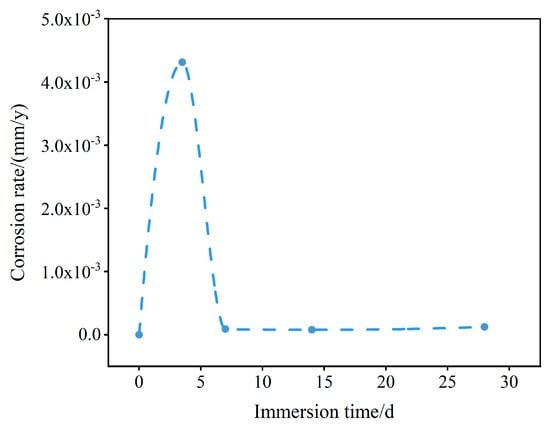 Figure 8 displays the N80 steel polarization curves that were obtained at different immersion periods. The rate of corrosion for the N80 steel sample was determined using the Tafel extrapolation method. Specifically, a linear fit was applied within a linear interval where either the anode or cathode curve exceeded or fell below the corrosion potential by 50 mV. The rate of corrosion was calculated by converting the corrosion current, which was determined at the point of intersection between the straight line and the potential for corrosion. The results of these calculations are provided in Table 3 and Table 4. The calculated values revealed that the corrosion rate gradually decreased within the immersion period of 3.5 days to 14 days, and then accelerated at 28 days (Figure 9). Specifically, the corrosion rates after 3.5 days, 7 days, and 14 days of immersion were 4.31 × 10−3 mm/y, 8.78 × 10−5 mm/y, and 7.54 × 10−5 mm/y, respectively. As a result, the rate of corrosion for the sample declined as the immersion duration increased. One possible explanation for this decrease might be the formation of corrosion products on the material’s surface, which provide protection. Electrochemically, this phenomenon could be explained through resistance polarization. However, by the 28th day, the corrosion rate had slightly increased. There were several factors that could have contributed to this, such as secondary dissolution of the coating of corrosion products and the replacement of Ca and Mg ions, leading to structural damage of the corrosion product layer.