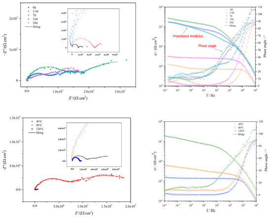 To further explore the corrosion behavior of N80 steel in different conditions, we conducted EIS tests at various stages. During the immersion period of 0 to 14 days, the EIS results showed the presence of high-frequency capacitive reactance arcs and low-frequency capacitive reactance arcs, as illustrated in Figure 10. Typically, larger diameters of the capacitive arcs indicated a more difficult charge transfer on the metal surface and a lower degree of corrosion [31]. As the immersion time extended, the complete capacitive arc shifted gradually towards the low-frequency region, and its diameter progressively increased, indicating a gradual reduction in the level of corrosion. As a result, the Bode figure showed a progressive increase in the impedance modulus at lower frequencies, accompanied by an increase in the maximum phase angle. This observation suggested an enhancement in the sample’s ability to resist corrosion over time [32]. Concurrently, the buildup of products from corrosion on the metal exterior led to a gradual strengthening and densification of the film resulting from corrosion, which continued until the 14th day of immersion. However, by the 28th day, the intact corrosion product film either peeled off or suffered destruction, leading to a continuation of the corrosion intensification. This assessment was based on the comparison of the Bode plot data, where both the impedance modulus and the maximum phase angle at 28 days exhibited a decrease in comparison to the 14-day immersion period.